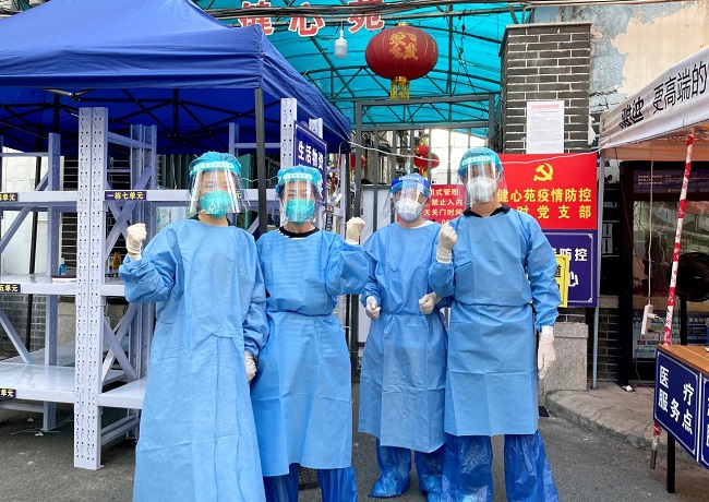 來自建行四川省分行住房金融業務部的4名志愿者在高風險小區集結,配合開展防疫志愿服務。建行四川省分行供圖