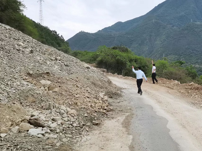 地震發生后,建行瀘定支行“張富清金融服務隊”三名隊員下車提醒前方來車注意落石。建行四川省分行供圖