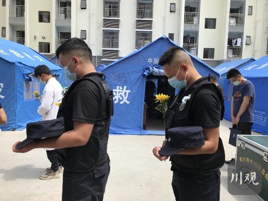 9月12日12時52分,瀘定縣得妥鎮政府,防空警報鳴響,100余名各界群眾向“9·5”瀘定6.8級地震遇難同胞默哀。他們有奮戰在救援一線的解放軍戰士、武警戰士、消防隊員、公安民警、醫護人員等,有從各地支援得妥的志愿者,也有參與自救互救的受災群眾。