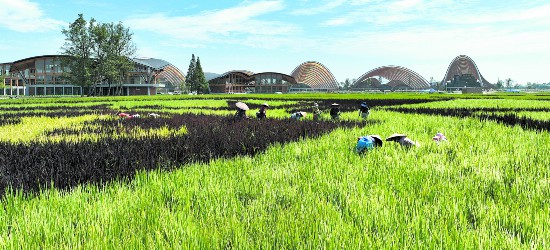遠遠望去,主展館對面的“青苗”從稻田中露出尖尖角。農博園四季建筑地景“春季青苗”由5棵“青苗”、一棟景觀塔組成,觀景塔是整個農博島的最高點,能俯瞰島內一整片美景?!扒嗝纭钡?個場館都有獨立功能,包括都市現代農業館、藝術場館、異域風情場館、書畫場館、活動空間場館。