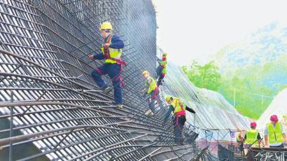 國慶節期間,在向家壩灌區北總干渠一期一步工程—大地灣渡槽項目施工點,工人正加緊對渡槽進行鋼筋綁扎施工。 向家壩灌區公司供圖