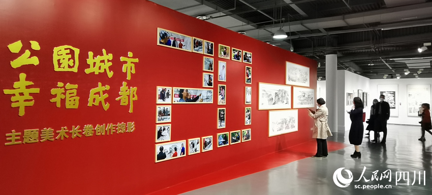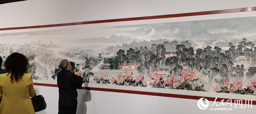 高1.25米、長20米的國畫長卷《公園城市 幸福成都》,凝聚了12位書畫家的心血,代表著2000多萬成都人民的藝術感受,成了參觀市民矚目欣賞的重點作品。