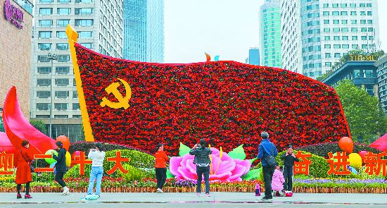 成都天府廣場,市民在“喜迎二十大 奮進新征程”的花壇前留影
