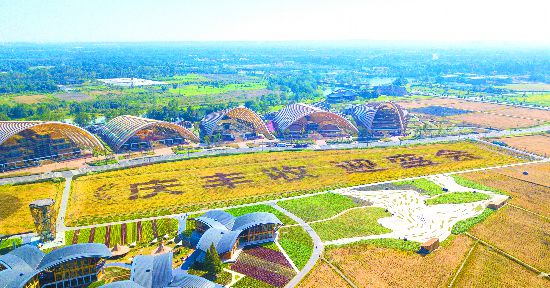 新津區興義鎮天府農博園,慶祝的標語格外醒目