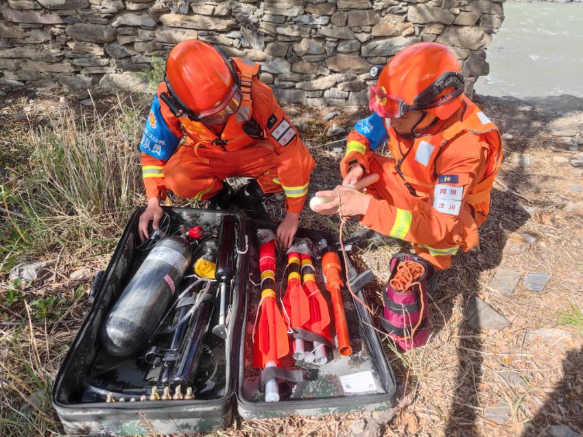 橫渡救援訓練安裝救生拋投器(蔡茂強右一)。四川森林消防總隊供圖