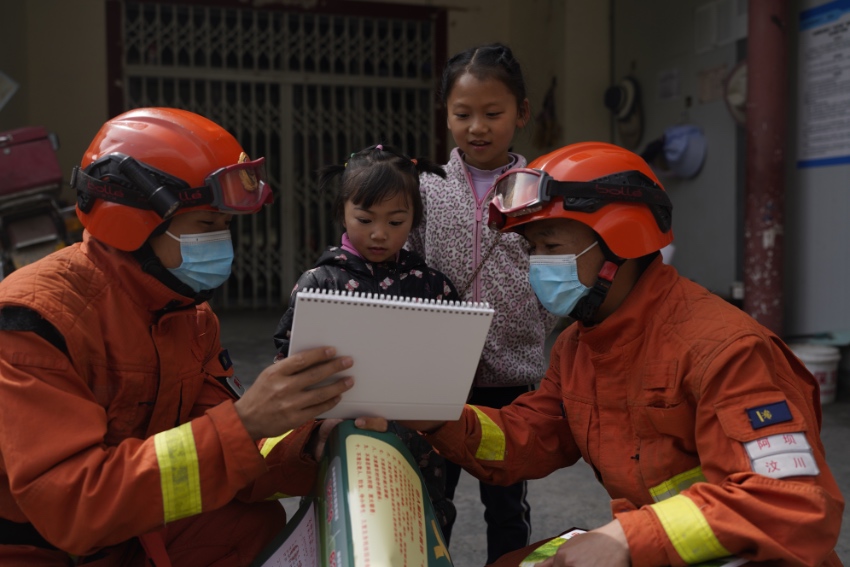 教育引導小朋友學習森林草原防火(蔡茂強左一)。四川森林消防總隊供圖