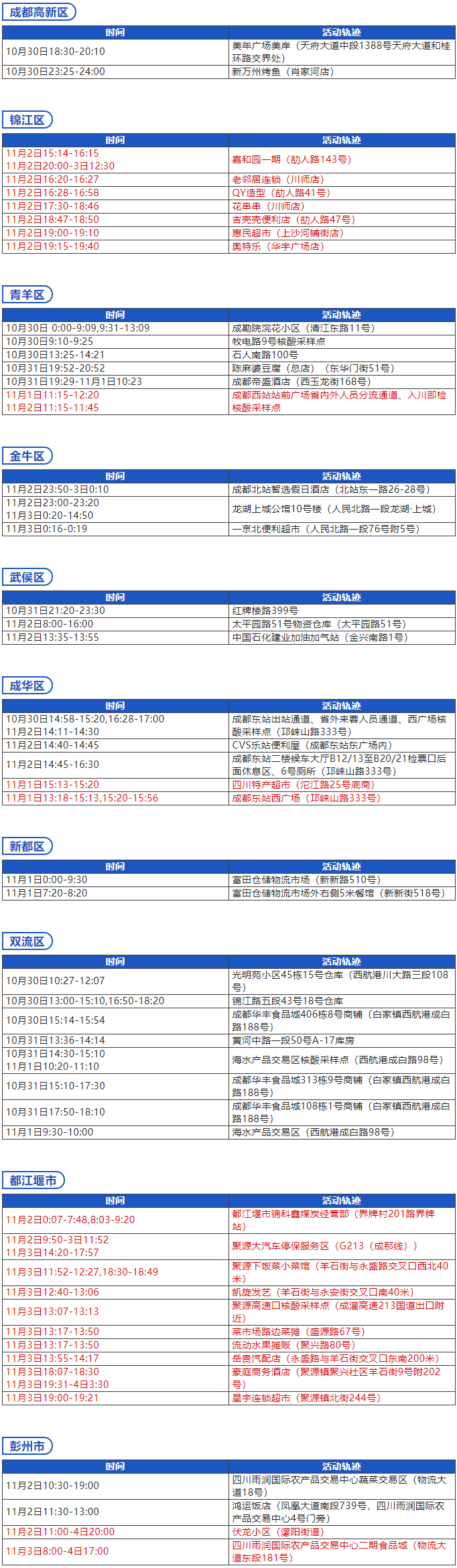 近期新增感染者和外地病例在蓉軌跡現公布如下,如與以下活動軌跡有重疊,立即向社區和單位(或居住的酒店)報備,三天內接受三次核酸檢測(間隔24小時),期間做好個人防護,不聚會、不聚餐。如有疑問,請撥打12345咨詢。