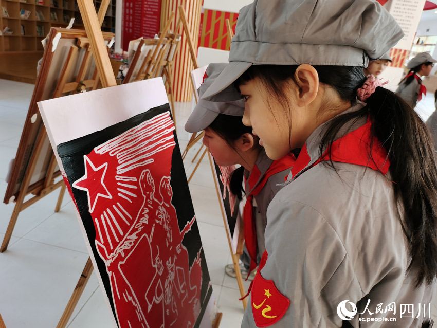 同學們觀看愛國題材藝術作品。人民網 劉海天攝