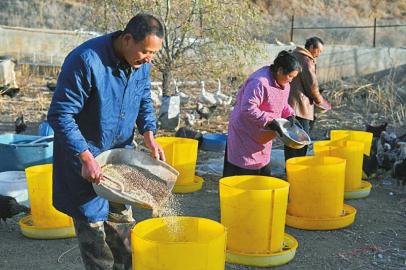 11月22日,臧濤(左一)在爐霍縣蝦拉沱鎮扎交村高原藏香雞生態養殖場內,帶領村民為藏香雞準備飼料。