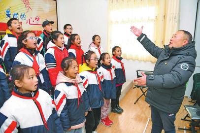 11月23上午,余建國(右一)在爐霍縣新都小學音樂教室內指導孩子們合唱。