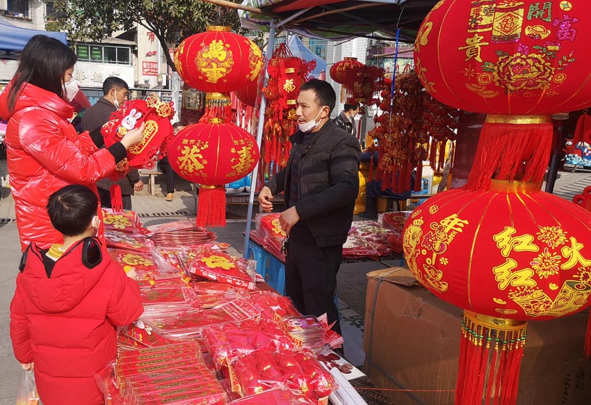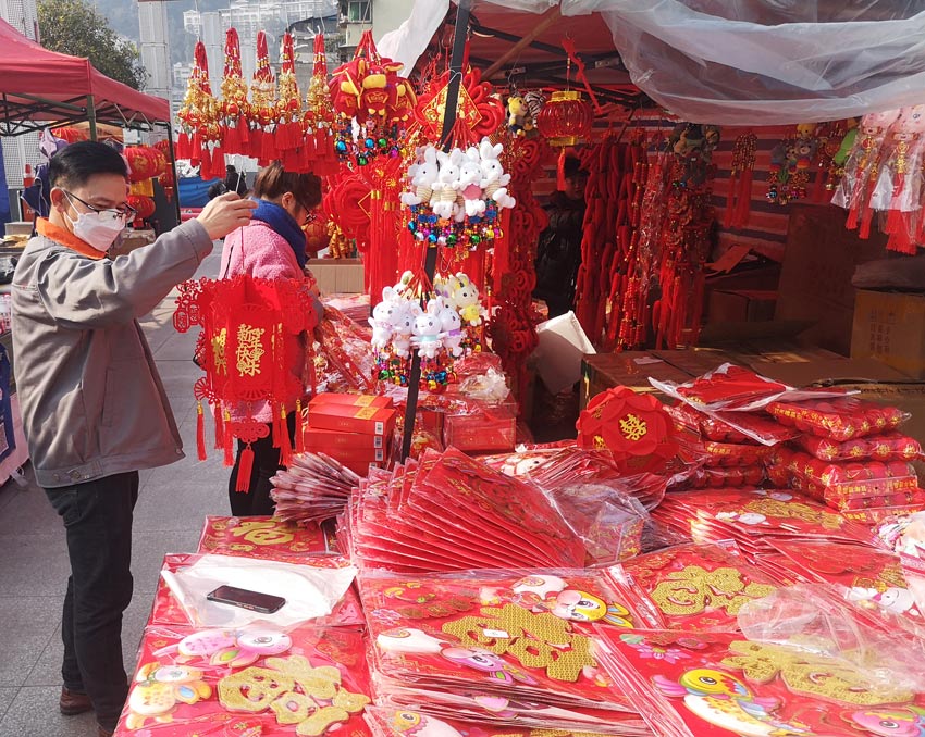隨著春節臨近,四川省巴中市南江縣以“兔年”為主題的各種對聯、年畫、“?!弊值蕊椘芳娂娚霞?。人們開始選購新春飾品,迎接新春佳節。圖為1月7日,居民在南江縣集州街道一處年貨市場內選購春節飾品。(劉海天、劉曉龍)