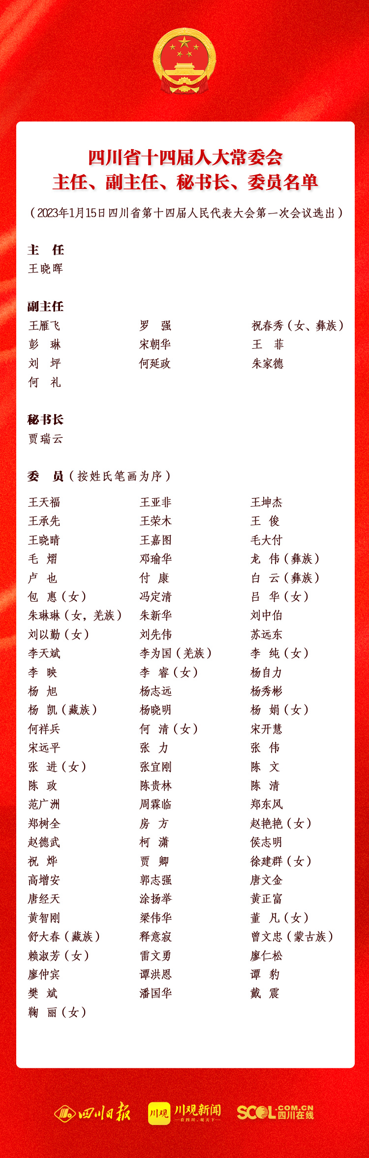一圖速覽丨四川省十四屆人大常委會主任、副主任、秘書長、委員名單