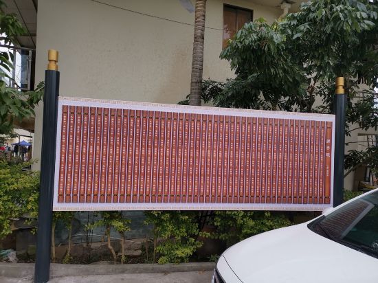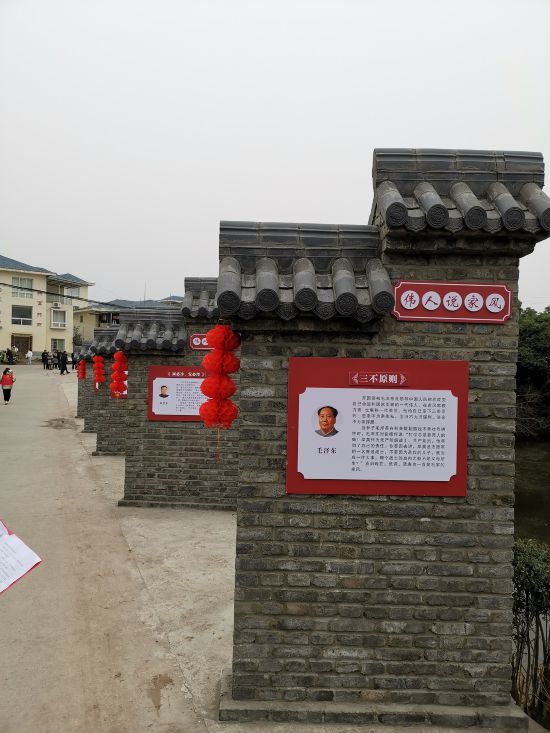 當日,在該村共贏家風大院,家風文化牌坊、長廊、石刻家風賦等家風展示平臺相繼投用。家風文化牌坊所書長聯“為洞施福澤爐布禎祥承繼家風綿懿德,同享共贏成人達己振興文化肇嘉聲”,為富順當地書法名家譚逢平所寫,字體端莊俊秀。家風文化長廊共有六面壁墻,登載多位偉人關于家風的語錄以及“仁、義、禮、智、信”相關內容,目的是讓過往村民在潛移默化中踐行“格物致知、誠意正心”。