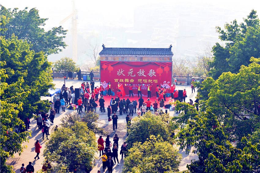 “新年步步高,節節向上攀?!?月30日上午,在英雄黃繼光的故鄉四川省中江縣,2023年“狀元魁·登高會”活動在魁山公園掀起熱潮?!盃钤獖Z魁”新春登山、“才高八斗”猜燈謎、“魁閣攬勝”祈福觀景、“狀元放歌”百姓舞臺等傳統活動,吸引了不少市民參與。大家滿懷期待,登高許下新年心愿。