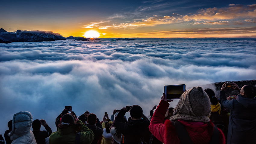 游客在雅安市寶興縣達瓦更扎景區觀云海。雅安市文化體育和旅游局供圖