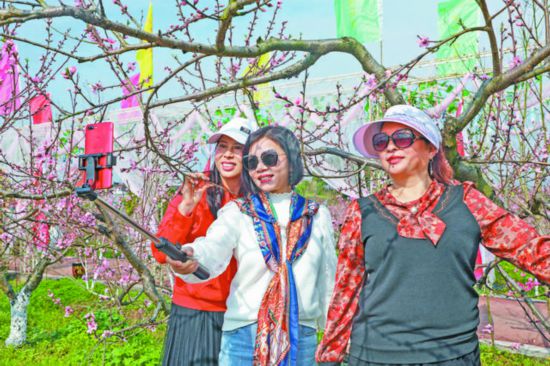 “十里桃花”盛景也吸引游客們紛紛拿起手機、相機,將這一美好畫面記錄下來?!疤一ê苊?,真是不虛此行!”專程從重慶來前鋒游玩的張小宇,一邊給家人拍照一邊告訴記者,他們打算多拍點照片發到微信朋友圈,讓更多的親朋好友都過來玩。