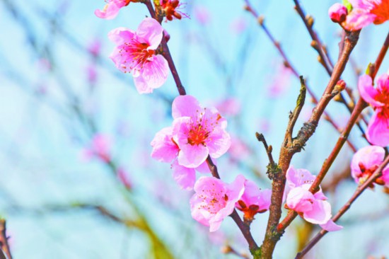 游客們漫步桃園,宛如置身于一片粉色的海洋,微風拂過,花海隨風波動,花香四溢、沁人心脾。湊近端詳,綴滿枝頭的桃花,三五成叢,有全盛開的、半盛開的,也有含苞待放的,在鄉間田野的映襯下,別有一番“桃之夭夭,灼灼其華”的韻味。