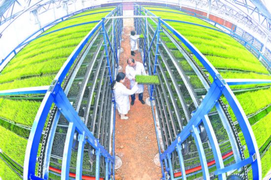 技術員在觀察秧苗生長情況。