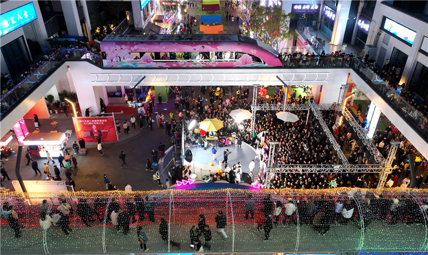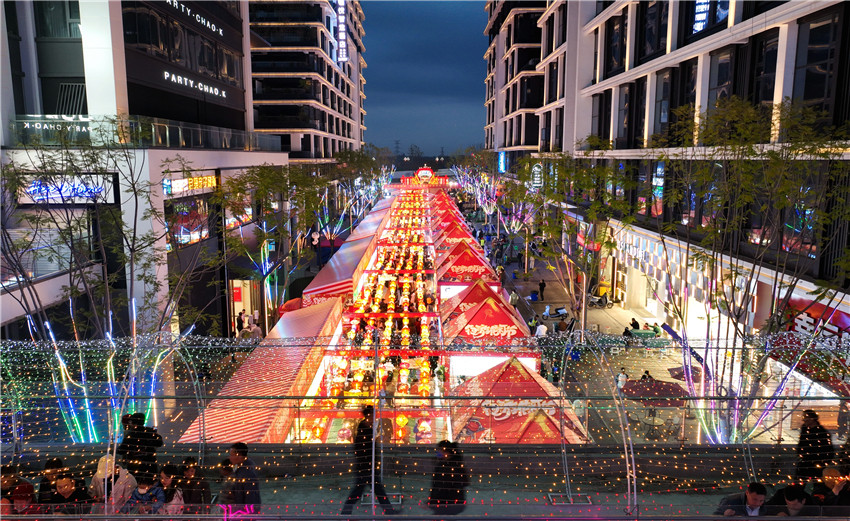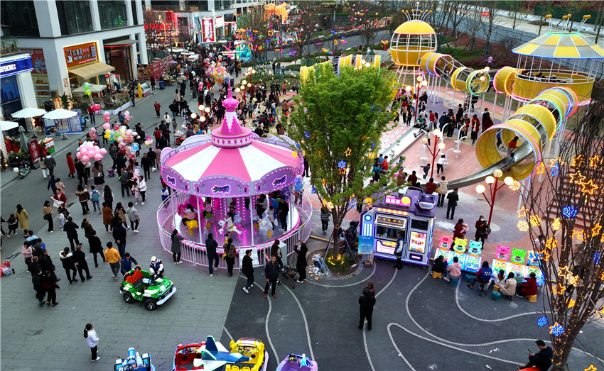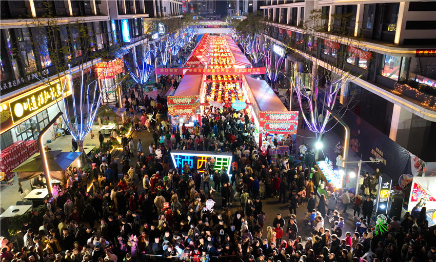 3月26日晚上,在四川省眉山市仁壽縣棲西里商業街區,一個個夜市攤位“串”起了充滿煙火氣的“夜經濟”。市民們在此游覽消費、休閑娛樂,觀看非遺“打鐵花”、欣賞文藝表演……在熱鬧的氛圍中,人們樂享一片繁華的夜空。