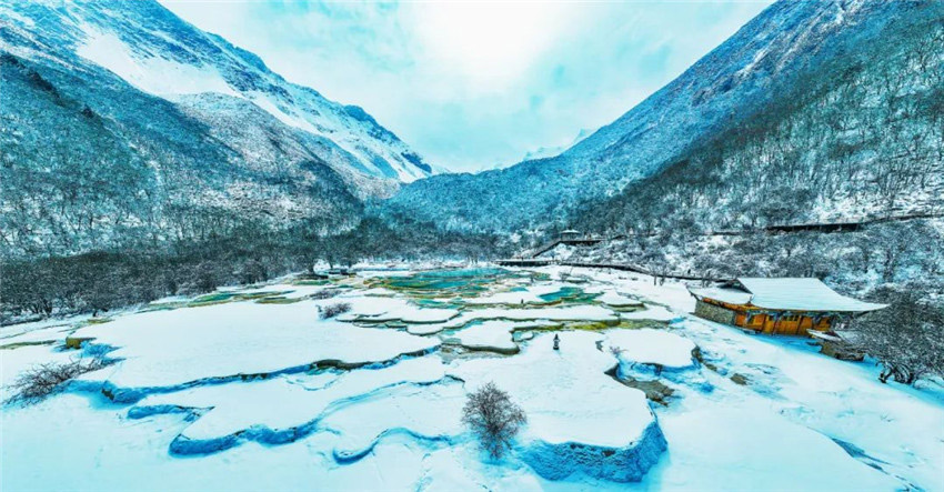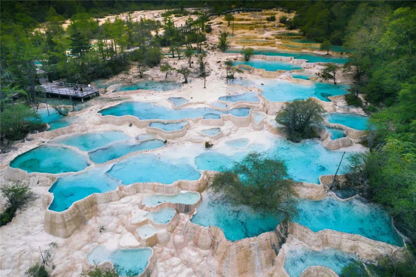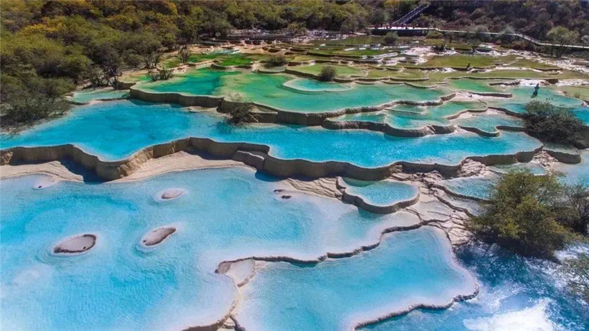景區最大的彩池群落——五彩池作為黃龍的璀璨明珠,總是在四季美得別具一格。梯田式的彩池排列有序,水中色彩斑斕,呈現出繽紛奪目的光彩,清新的黃、澄澈的綠、沉靜的藍,無比令人炫目。(九寨溝景區、黃龍景區供圖)
