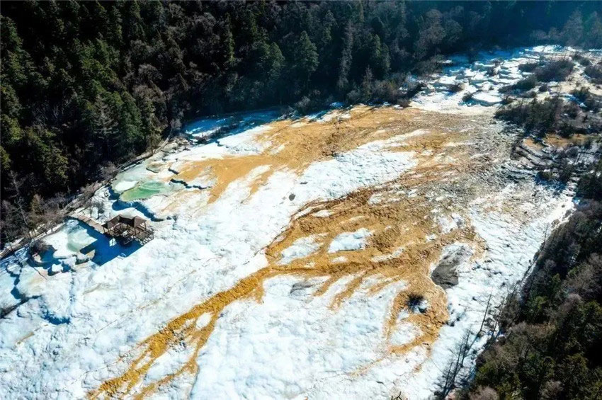 黃龍景區官微發文表示,游客們請不要懷疑自己的手機和眼睛,實際上這都是大自然的安排!目前,黃龍正處于冬春兩季的枯水期,因此相對豐水期的彩池就樸素了些。