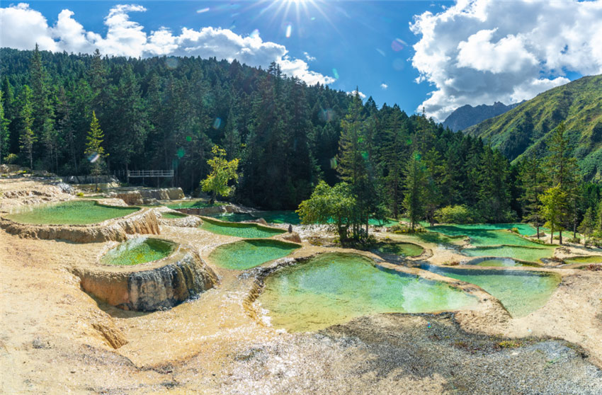 富含鈣離子的泉水是鈣華景觀形成的源泉。黃龍景區地表水(含黃龍轉化泉泉水)主要來源于大氣降水。而黃龍風景區受季風氣候的影響,降水主要集中在6-10月,約占全年降水的72%。