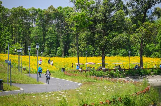 2022年元旦,環城生態區100公里環城綠道全線貫通,78座綠道橋梁相接,特色園、林盤院落逐步串珠成鏈,成為國內外超大城市中心城區第一條100公里無障礙綠道,2022年總騎行量突破1304萬人次!隨著文化創意、科研、藝術、體育等公共服務功能逐步完善,可進入、可參與、可感知、可欣賞、可消費的環城生態區,成為了市民放飛身心、詩意棲居、愉悅徜徉的美好生活空間。