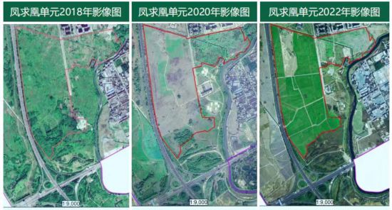 鳳求凰都市現代農業示范區是環城生態區農業整治的一個縮影。天府綠道集團相關負責人向記者展示了鳳求凰都市現代農業示范區的衛星對比圖。第一張拍攝于2018年,圖片中的地塊以綠色為主?!暗@些綠,其實都是撂荒耕地上長出的雜草、灌木與雜樹?!碧旄G道集團相關負責人說。第二張拍攝于2020年,圖片中的地塊以黃色為主,此時正處于整治階段,“我們清除了雜樹雜草,通過實施土地綜合整治,小田并大田,耕地數量增加了、耕地質量提高了、農田生態改善了、田型布局優化了,還耕地以本來面目”。第三張圖片拍攝于2022年,圖片中的地塊恢復為整齊的綠色,規?;霓r田保護區的模樣初現。