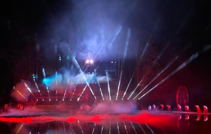 整場演出摘取威遠發展史上的高光片段和代表性文化元素,與燈光視效等互動手段相互結合,在山水間施展潑墨重彩,與舞美、投影虛實結合,組成了一幅美麗的全景式山水畫卷,營造出強烈的視覺效果和藝術沖擊力,讓觀眾在穹窿山水間享受視聽盛宴。
