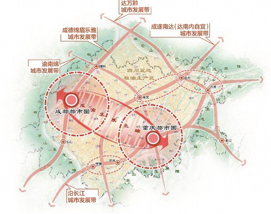 打造沿長江城市發展帶、成德綿眉樂雅城市發展帶、成遂南達(達南內自宜)城市發展帶、渝南綿城市發展帶、達萬黔城市發展帶,發展區域中心城市和城市組群,推動南翼跨越、北翼振興
