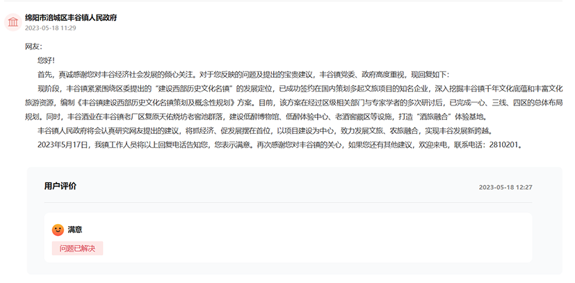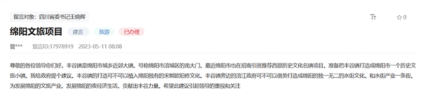 有回音 | 網友對綿陽市建設西部歷史文化名鎮豐谷鎮提出建議 當地政府回應