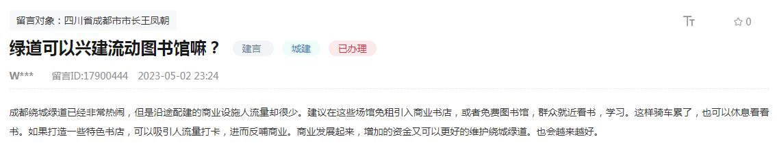 該網友留言稱,成都繞城綠道非常熱鬧,但是沿途配建的商業設施人流量卻很少,建議在這些場館免租引入商業書店或者免費圖書館,方便群眾就近看書、學習。這樣騎車累了,也可以休息看看書。如果打造一些特色書店,可以吸引人流量,進而反哺商業。商業發展起來,增加的資金又可以更好地維護繞城綠道。