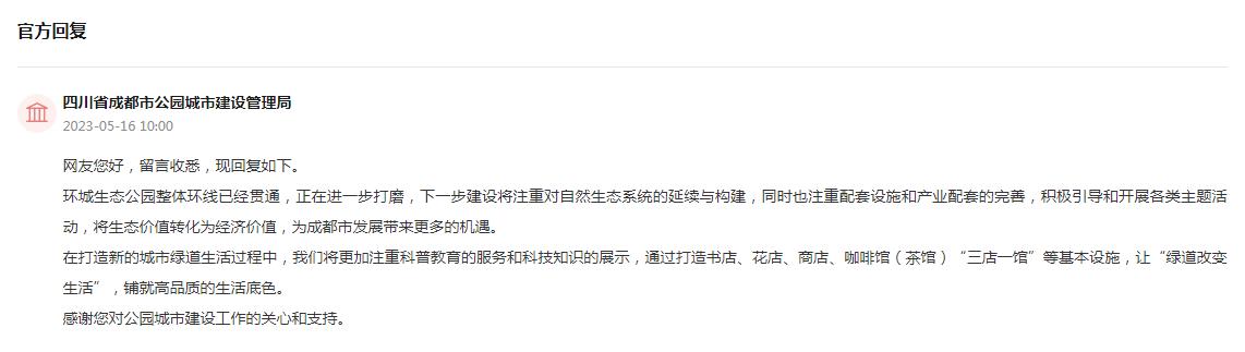 人民網成都6月6日電 日前,有網友在人民網“領導留言板”上反映,成都繞城綠道沿途配套的商業設施較少,建議免租引入商業書店或者免費圖書館,吸引人流量反哺商業,從而有更多資金來維護繞城綠道。對此,相關部門作出了答復。