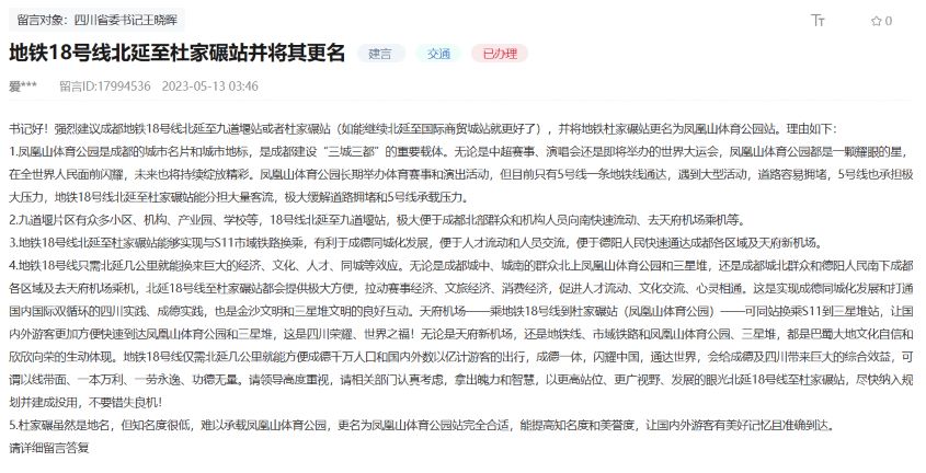 這位網友在留言中表示,建議成都地鐵18號線北延至九道堰站或者杜家碾站(如能繼續北延至國際商貿城站更好),并將地鐵杜家碾站更名為鳳凰山體育公園站。
