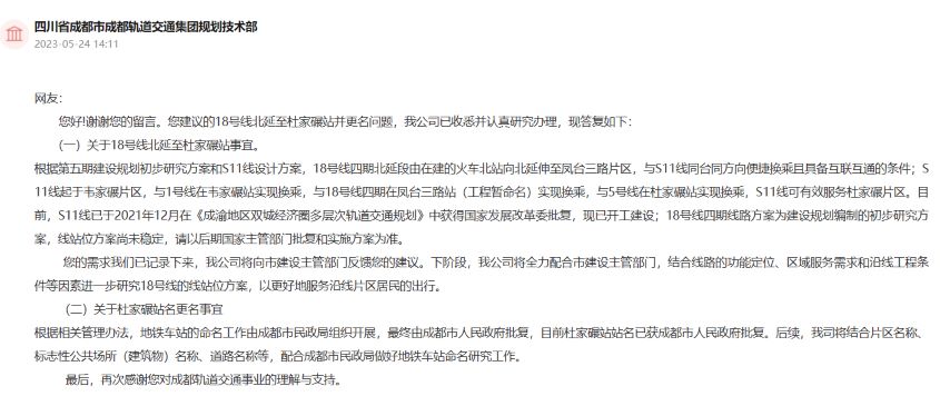 在回復中,成都軌道交通集團規劃技術部表示已收悉并認真研究辦理。就18號線北延至杜家碾站事宜,根據第五期建設規劃初步研究方案和S11線設計方案,18號線四期北延段由在建的火車北站向北延伸至鳳臺三路片區,與S11線同臺同方向便捷換乘且具備互聯互通的條件;S11線起于韋家碾片區,與1號線在韋家碾站實現換乘,與18號線四期在鳳臺三路站(工程暫命名)實現換乘,與5號線在杜家碾站實現換乘,S11線可有效服務杜家碾片區。目前,S11線已于2021年12月在《成渝地區雙城經濟圈多層次軌道交通規劃》中獲得國家發展改革委批復,現已開工建設;18號線四期線路方案為建設規劃編制的初步研究方案,線站位方案尚未穩定,以后期國家主管部門批復和實施方案為準。但下一階段,成都軌道集團將全力配合市建設主管部門,結合線路的功能定位、區域服務需求和沿線工程條件等因素進一步研究18號線的線站位方案,以更好地服務沿線片區居民的出行。