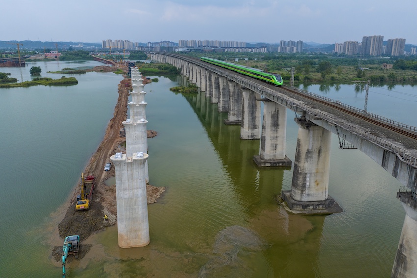 成達萬高鐵遂寧涪江特大橋部分橋墩已完工,旁邊一列動車組快速駛過。成蘭公司供圖