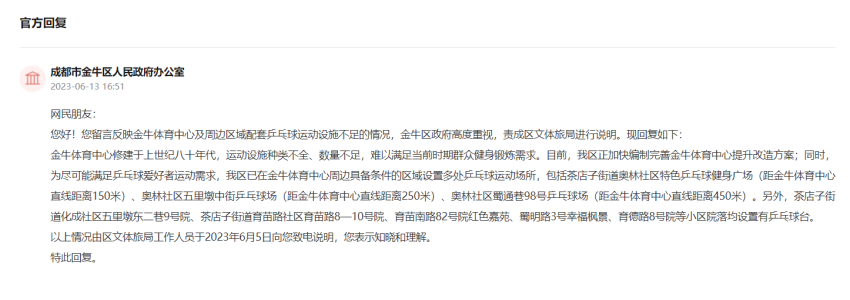 人民網成都6月26日電 日前,有網友在人民網“領導留言板”上反映,希望成都市金牛區體育場能夠增設乒乓球運動設施,同時增加建設此類貼近于老百姓的公共運動場地。對此,成都市金牛區人民政府辦公室進行了公開答復。