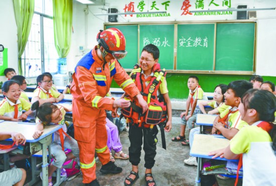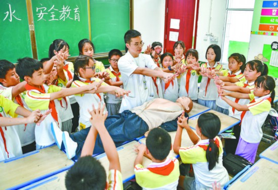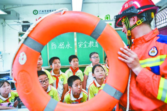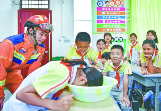 6月26日,消防隊員在前鋒區前鋒小學給學生講解溺水施救知識。 暑假來臨,廣安市各地中小學校開展以“珍愛生命、嚴防溺水”為主題的防溺水安全教育活動,通過向學生講解防溺水安全知識、溺水施救、窒息體驗等方式,增強學生防溺水安全意識,提升自防自護自救能力,讓學生安全、快樂地度過暑假。前鋒融媒 姜曦悅 廣安日報記者 張啟富 文/圖