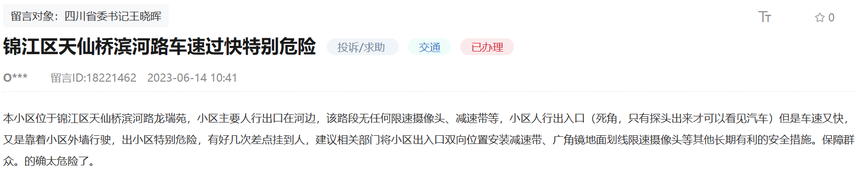 網友在留言中表示,自己所居住的小區位于錦江區天仙橋濱河路龍瑞苑,該小區主要人行出口在河邊,此路段無任何限速攝像頭、減速帶等。該網友稱,“小區人行出入口是死角,只有探頭出來才可以看見汽車,但是汽車車速又快,又是靠著小區外墻行駛,出小區特別危險,有好幾次差點掛到人”。他建議相關部門將小區出入口雙向位置安裝減速帶等安全裝置,以保障群眾出行。