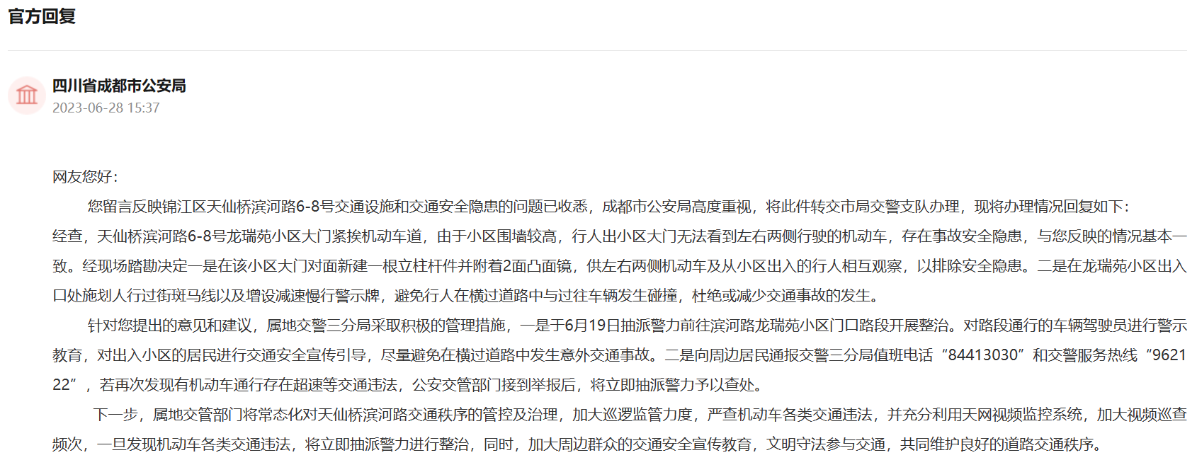 針對網友反映的這個問題,成都市公安局高度重視,將此件轉交市局交警支隊辦理,并于6月28日予以回復。