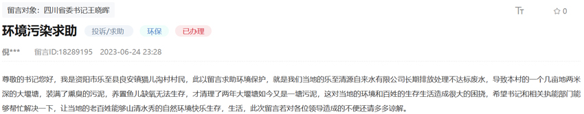 6月24日,有網友在人民網“領導留言板”上留言:資陽市樂至縣清源自來水有限公司長期排放處理不達標廢水,對當地的環境和百姓的生存生活造成很大困擾。收到留言后,樂至縣水務局立即督促該公司解決上述問題,并于近日進行了回復。