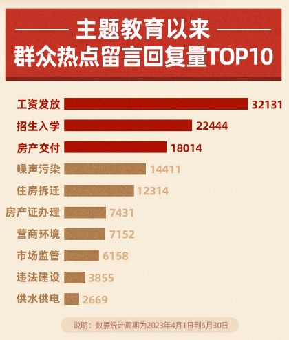 自4月全黨開展學習貫徹習近平新時代中國特色社會主義思想主題教育以來,各地區各部門領導干部踐行為民服務宗旨,人民網“領導留言板”成為問題梳理、難題排查的網絡抓手,各地重點關注群眾反映的堵點、痛點、難點,精準調研、針對施策,切實解決民生關切問題,讓群眾看到真真正正的變化、得到實實在在的實惠。數據顯示,工資發放、招生入學、房產交付是上半年各地群眾反映最多的急難愁盼問題,也是各地領導干部回復辦理最多的“時時放心不下”。