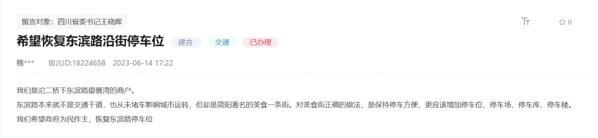 該網友在留言中表示,東濱路不是城市交通干道,也未堵車影響城市交通運轉,但其作為簡陽著名的美食一條街,應增加停車位、停車場、停車庫、停車樓,以方便市民出行。