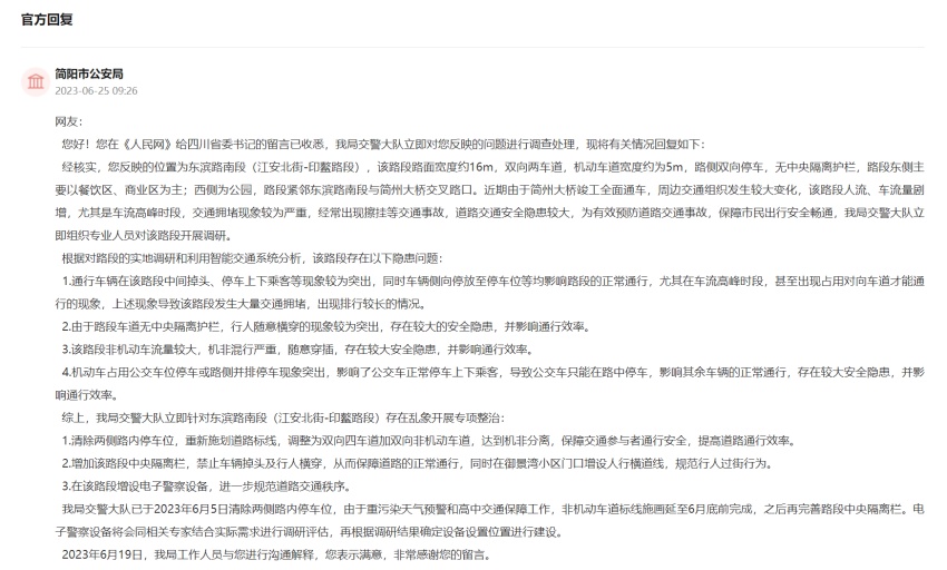 針對該網友的留言和建議,簡陽市公安局交警大隊立即展開實地調查,并予以回復?;貜头Q,網友反映的位置為東濱路南段(江安北街-印鰲路段),該路段路面寬度約16米,為雙向兩車道,機動車道寬度約為5米,路側雙向停車,無中央隔離護欄,路段東側主要以餐飲區、商業區為主;西側為公園,路段緊鄰東濱路南段與簡州大橋交叉路口。近期由于簡州大橋竣工全面通車,周邊交通組織發生較大變化,該路段人流、車流量劇增,尤其是車流高峰時段,交通擁堵現象較為嚴重,經常出現擦掛等交通事故,道路交通安全隱患較大,為有效預防道路交通事故,保障市民出行安全暢通,簡陽市公安局交警大隊立即組織專業人員對該路段開展調研。