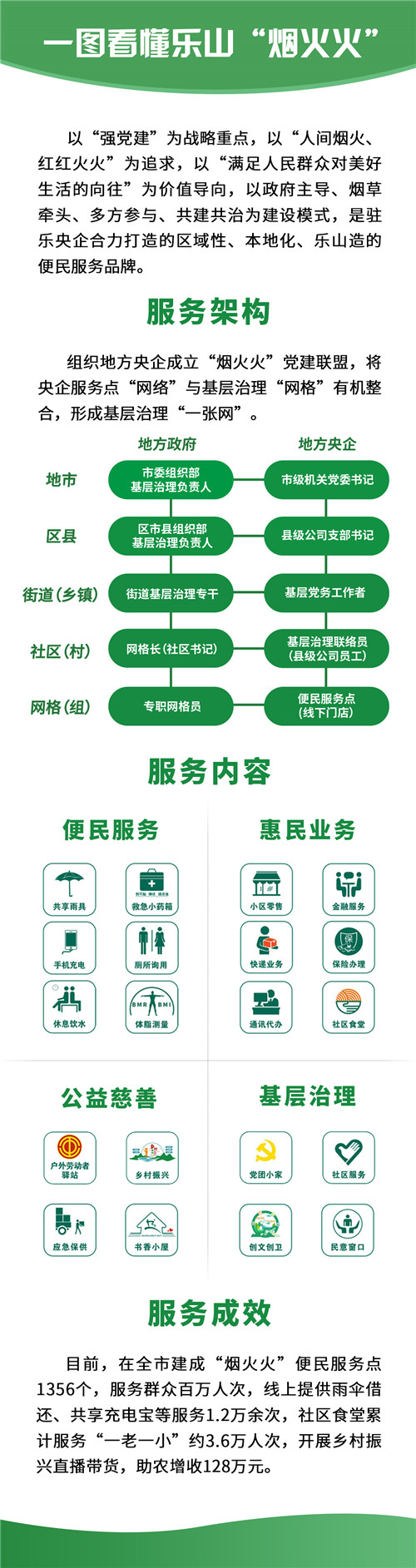 如今,樂山市煙草專賣局已經在全市建成“煙火火”便民服務點1356個,服務群眾達百萬人次,“煙火火”綜合服務平臺入駐商家2520戶、占比超20%;“煙火火”黨建聯盟協同建設“煙火社家”。