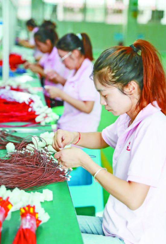 華鎣山經開區領創電子有限公司線束車間的員工在流水線上緊張作業。 華鎣融媒 邱海鷹 攝