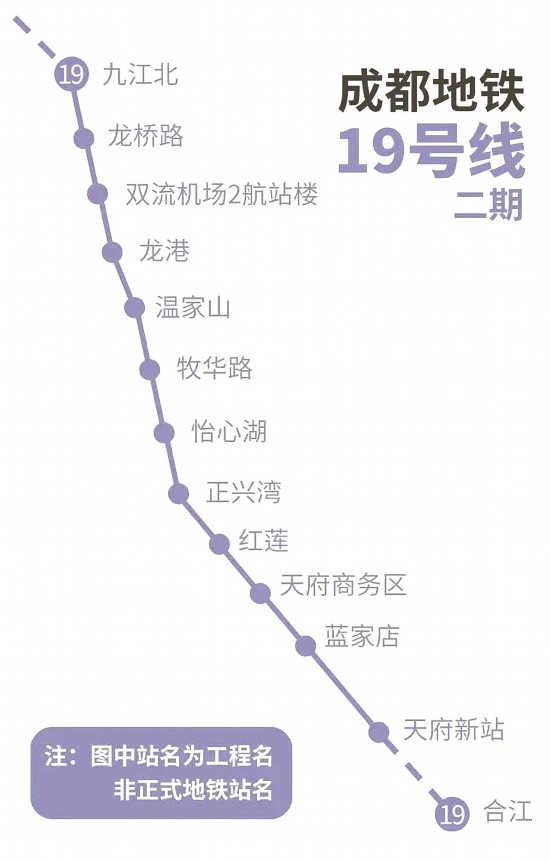 全長約42.87公里的19號線二期工程集市域通勤快線及雙機場快線功能為一體,銜接雙流國際機場和天府國際機場兩個門戶樞紐,共設12個車站,全部為地下線。