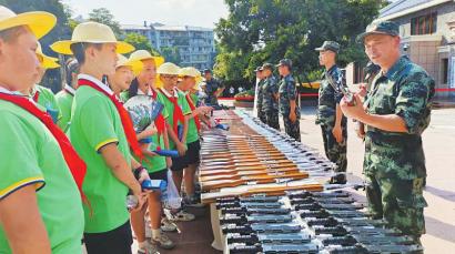 9月15日,瀘州市舉行2023年全民國防教育軍事模型展,教官正在為參觀學生講解軍事器材使用方法。