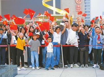 2023年10月1日,中華人民共和國迎來74周年華誕。當天早上6時許,成都天府廣場人潮涌動,大家揮舞著手中的國旗,等待升旗儀式的到來,共同為祖國母親送上祝福。