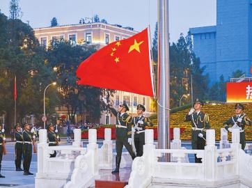 6時50分許,武警四川省總隊成都支隊“蓉城國旗護衛隊”官兵邁著鏗鏘有力的步伐進入天府廣場。隨著雄壯的國歌聲響徹天府廣場,國旗冉冉上升。7時左右,鮮艷的五星紅旗在人們深情祝福的目光中升至旗桿頂端,武警戰士、公安干警行軍禮,少先隊員行隊禮,現場爆發出雷鳴般的掌聲與歡呼。